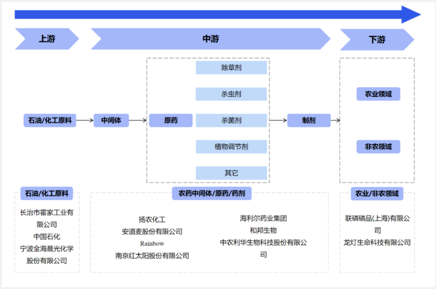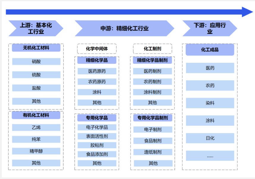 精细化工行业的上游产业主要是基础化工行业,包含无机化工原料和有机化工原料;中游包含化学中间体和化工制剂两大细分领域,前者包含精细化学品和专用化学品,后者包含精细化学品制剂和专用化学品制剂;下游应用场景主要包含医药、农药、染料和日化等应用市场。