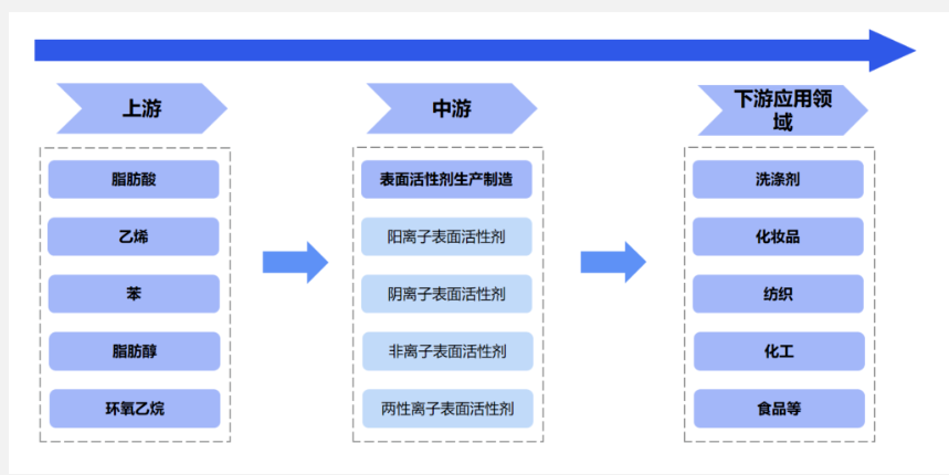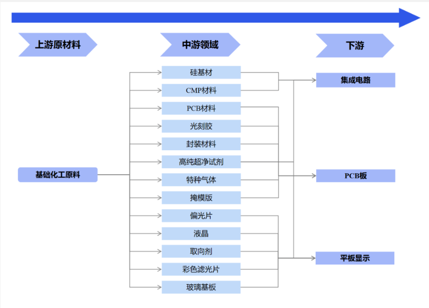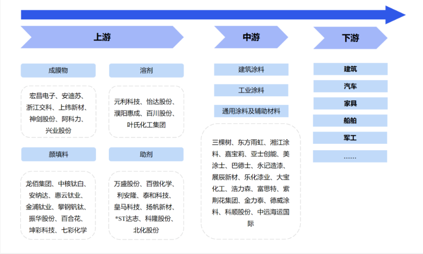 上游分析 精细化工上游包含无机化工原料和有机化工原料,其中无机化工原料包括硫酸、烧碱、硝酸、纯碱等,有机化工原料包括乙烯、纯苯、甲醇、冰醋酸、合成氨等。 硫酸是一种重要的工业原料,可用于制造肥料、药物、炸药、颜料、洗涤剂、蓄电池等,也广泛应用于净化石油、金属冶炼以及染料等工业中。近年来,全国硫酸产量较为稳定,截至2022年12月底,全国硫酸产量9504.60万吨,同比增长1.3%。 硝酸属三大无机强酸之一且无替代产品,具有相对固定的消费结构,其中浓硝酸消费主要集中于苯胺、TDI、中间体及军工等领域,需求约占总量的48%、17%、16%;稀硝酸消费则包括硝酸铵、浓硝酸、硝基复合肥、己二酸、硝酸盐等。近五年产能与需求持续萎缩,2021年,国内浓硝酸产量降至182.1万吨,同比跌幅约11.8%。目前行业基本难有独立装置入市,新装置多配套下游,后市产能提升多靠现存装置升级为主,行业规模或将趋于稳定,产能布局稳健,短期华东一带的主体地位仍难以撼动。 乙烯是全球产量最大的石油化工产品,被称为“石化工业之母”,下游主要衍生物包括聚乙烯、聚氯乙烯、环氧乙烷/乙二醇、二氯乙烷、苯乙烯、乙醇、醋酸乙烯等多种化工产品。截至2022年12月底,全国乙烯产量达到2897.5万吨,同比增长2.5%。随着“十四五”规划的推进,乙烯行业一体化装置蓬勃发展,未来3-5年里中国乙烯市场的供需矛盾会进一步升级,供给侧改革下,乙烯行业原料端向轻质化发展,下游消费领域向高分子行业进军将成为主趋势。 甲醇上游可以由天然气、煤炭一次能源直接制得,也可以从煤焦化产生的焦炉煤气中制得;下游应用十分广泛,以甲醇为原料的一次加工品有近30种,深加工产品达上百种,主要为烯烃、醋酸等行业,以甲醇制烯烃为主,2021年占比达到50.6%,其次是甲醇燃料,需求占比为15.7%,应用范围涉及建材、能源和医药等多个行业。2022年我国甲醇产能达9947万吨,同比增长8.8%;产量达8306.6万吨,同比增长6.3%。 合成氨为农业化肥和工业炸药等产品的主要原材料,截至2021年底,全国合成氨产能合计6488万吨/年,同比减少49万吨/年。产业链上游参与主体主要为原材料供应商;产业链中游参与主体是合成氨生产商;产业链下游参与主体是氮肥生产商及硝酸铵生产商。我国合成氨主要运用于农业,从下游需求来看,其中尿素占比最大约61%,其他化肥占比19%,化工行业占比20%。 中游分析 精细化工中游包含化学中间体和化工制剂两大细分领域,前者包含精细化学品和专用化学品,而后者包含精细化学品制剂和专用化学品制剂。其中,精细化学品包括农药、染料颜料、医药原药、涂料等;专用化学品包括食品添加剂、电子化学品、胶粘剂、表面活性剂等。 农药.产业链的上游主要为苯、烯烃、醇、酯类等化工原料,通过合成加工成为中游的农药中间体、农药原药,最终生成不同配比的制剂,终端应用于下游的农林牧渔业生产和公共卫生等领域。 染料颜料.上游主要为原材料、中间体生产企业。中游为染料和印染助剂生产制造企业,主要分类有分散染料、活性染料等。下游主要为印染加工并最终流向服装、家纺等企业。 医药原药.原料药产业链上游为原材料,主要包括基础化工、植物种植和动物养殖;中游为中间体/原料药的加工制造,主要包括大宗原料药、特色原料药和专利原料药;下游为应用市场,主要包括医药、保健品、饲料、食品、化妆品等领域。 涂料.上游是原材料市场,主要由涂料制造所需的四类原材料构成,包括以树脂为主的成膜物、颜填料、溶剂和助剂;中游是涂料生产制造;下游是产品需求市场,主要应用于建筑、汽车、船舶、家具等行业。目前,我国涂料行业企业众多,市场集中度低,竞争激烈。 电子化学品.上游原材料是基础化工原料,包括烷烃及其衍生物、烯烃及其衍生物、醌类、醛类、醇类、无机酸、无机碱、无机盐以及工业气体等;中游是集成电路电子化学品(如硅基材、CMP材料、光刻胶、超净高纯试剂等)、PCB电子化学品(如水平沉铜专用化学品、化学镍金专用化学品、电镀铜专用化学品、蚀刻液和油墨等)、平板显示电子化学品(如液晶、取向剂、PI膜等)及其他电子化学品(如电子零器件、动力电池等表面防腐、抗磁等专用化学品)的制造;下游应用领域可分为集成电路、PCB板、平板等。相关龙头企业包括光华科技、上海新阳、景瑞电材、江化微、强力新材、新宙邦、金宏气体、飞凯材料、昊华科技、雅克科技、福斯特、隆基绿能、TCL中环、沪硅产业等。 胶粘剂.上游行业主要是基础化工原料制造商,化工原材料包括有机硅、合成树脂、丙烯酸及丙烯酸酯、MDI、TDI、溶剂油、助剂及单体等。下游应用领域极为广泛,包括建筑、建材、纺织、制鞋、包装、印刷装订、航空航天、电子制造、汽车、机械、体育用品等领域。 表面活性剂.可分为阳离子表面活性剂、阴离子表面活性剂、两性离子表面活性剂及非离子表面活性剂。产业链上游主要为脂肪酸、乙烯、苯、脂肪醇、环氧乙烷等原材料;中游为表面活性剂生产供应环节,主要包括离子和非离子表面活性剂;下游主要应用于洗涤剂、化妆品、纺织、化工、食品等领域。重点企业包括赞宇科技、丽臣实业等。 下游分析 精细化工下游应用场景主要包含医药、农药、染料、食品行业、电子行业和日化等应用市场。其中,